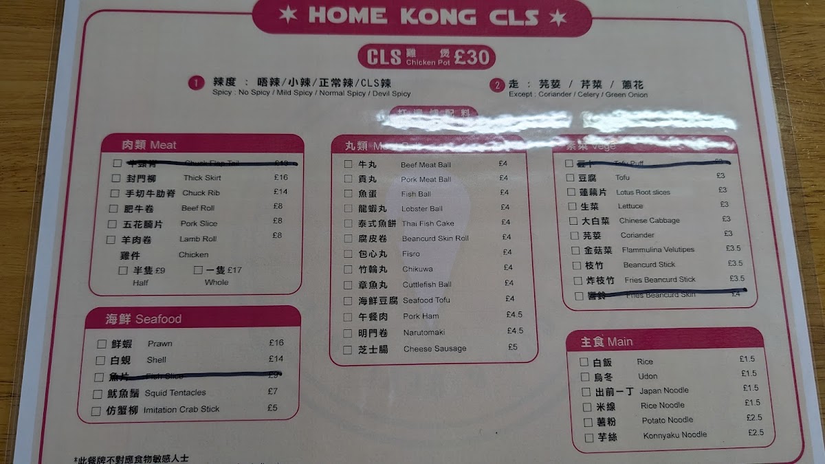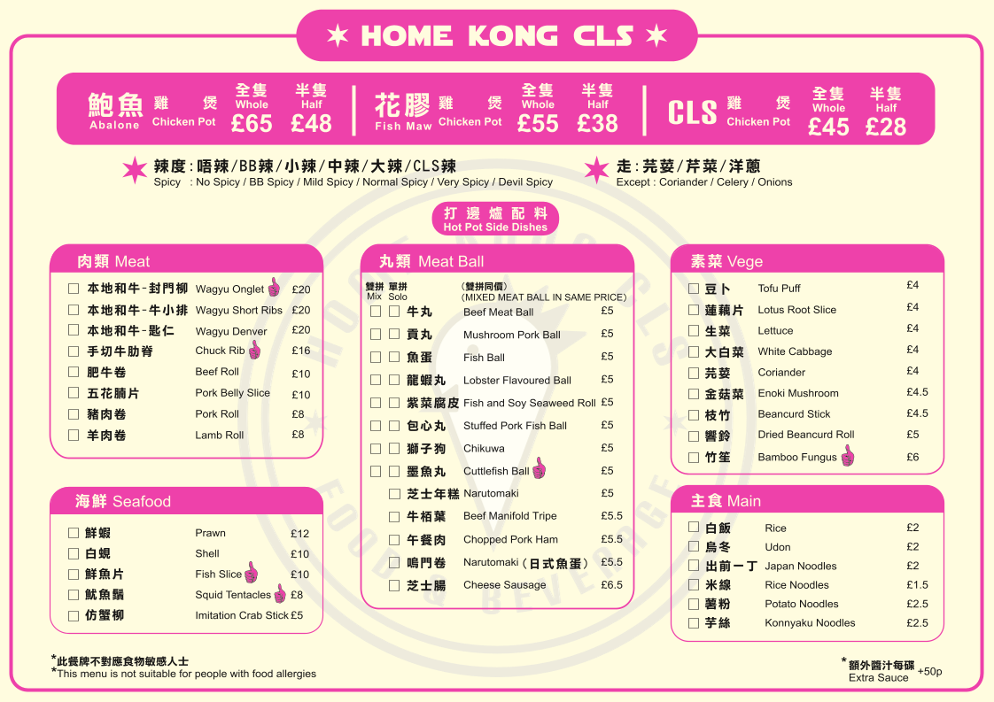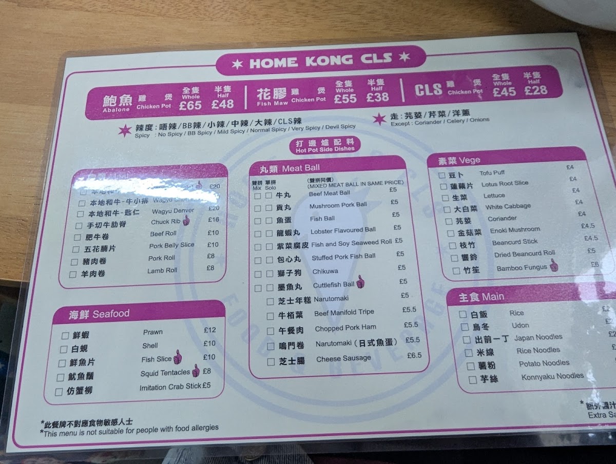 The menu at Home Kong CLS offers a variety of Hong Kong-style café dishes alongside hot pot selections, providing options suitable for light meals and casual dining. Diners can choose from a range of main dishes, meat options, and small plates that reflect the cha chaan teng and hot pot restaurant fusion.