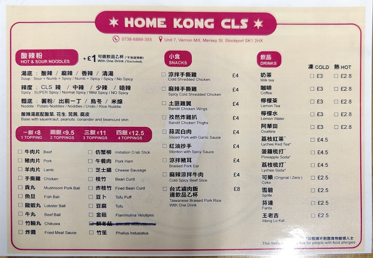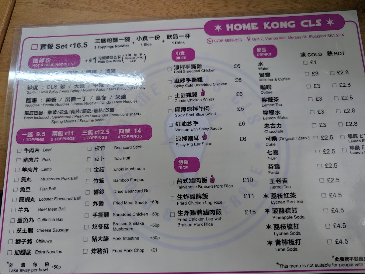 Overall, the menu is designed to cater to those looking for Hong Kong café classics, spicy hot pot variations, and accompanying snacks and drinks during lunch or dinner hours.